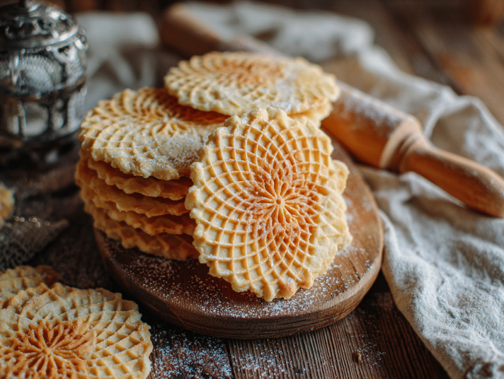 Pizzelles are traditional Italian cookies loved for centuries. They are thin, crisp wafers with a unique snowflake pattern. This pattern is made using a special pizzelle iron.